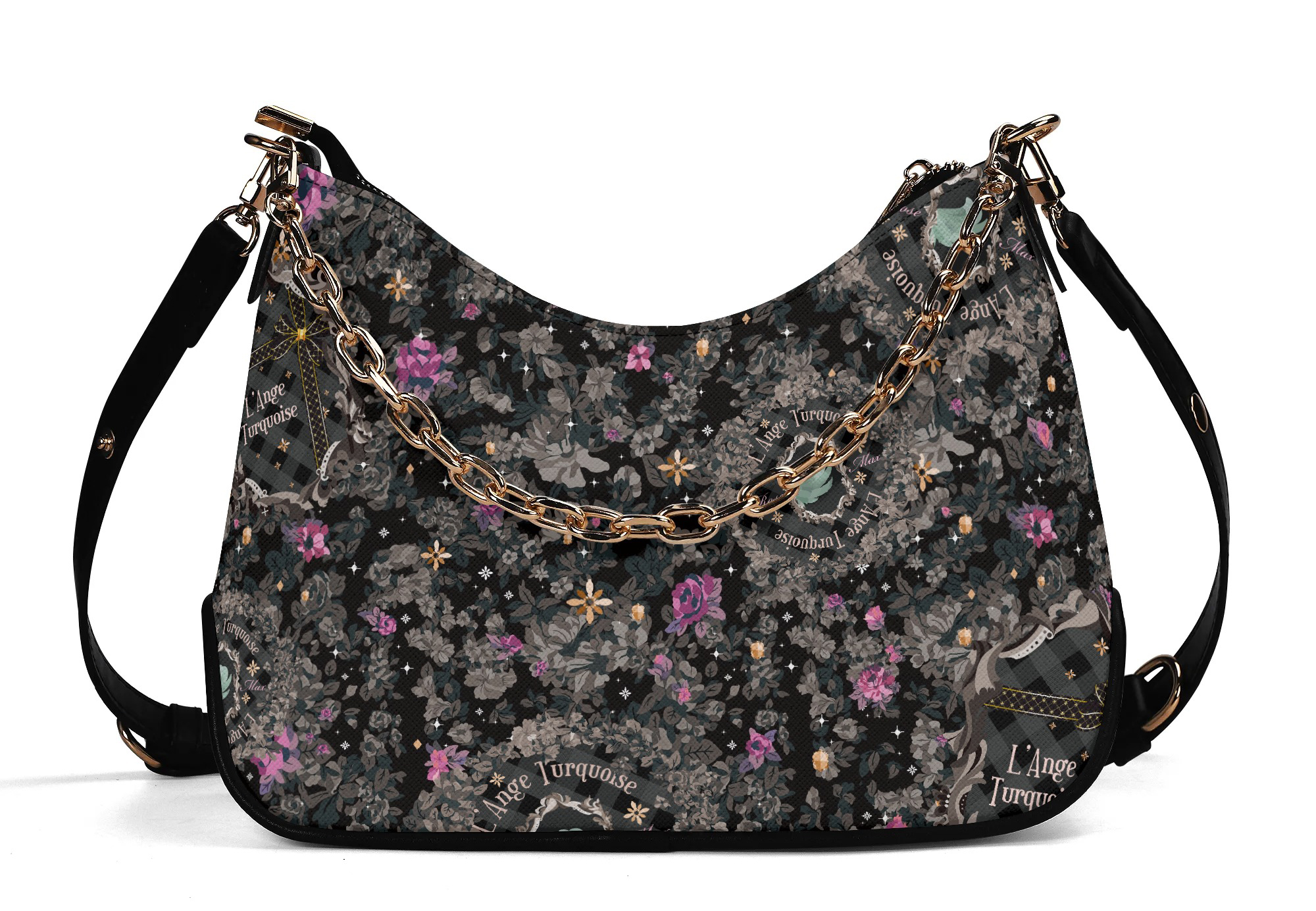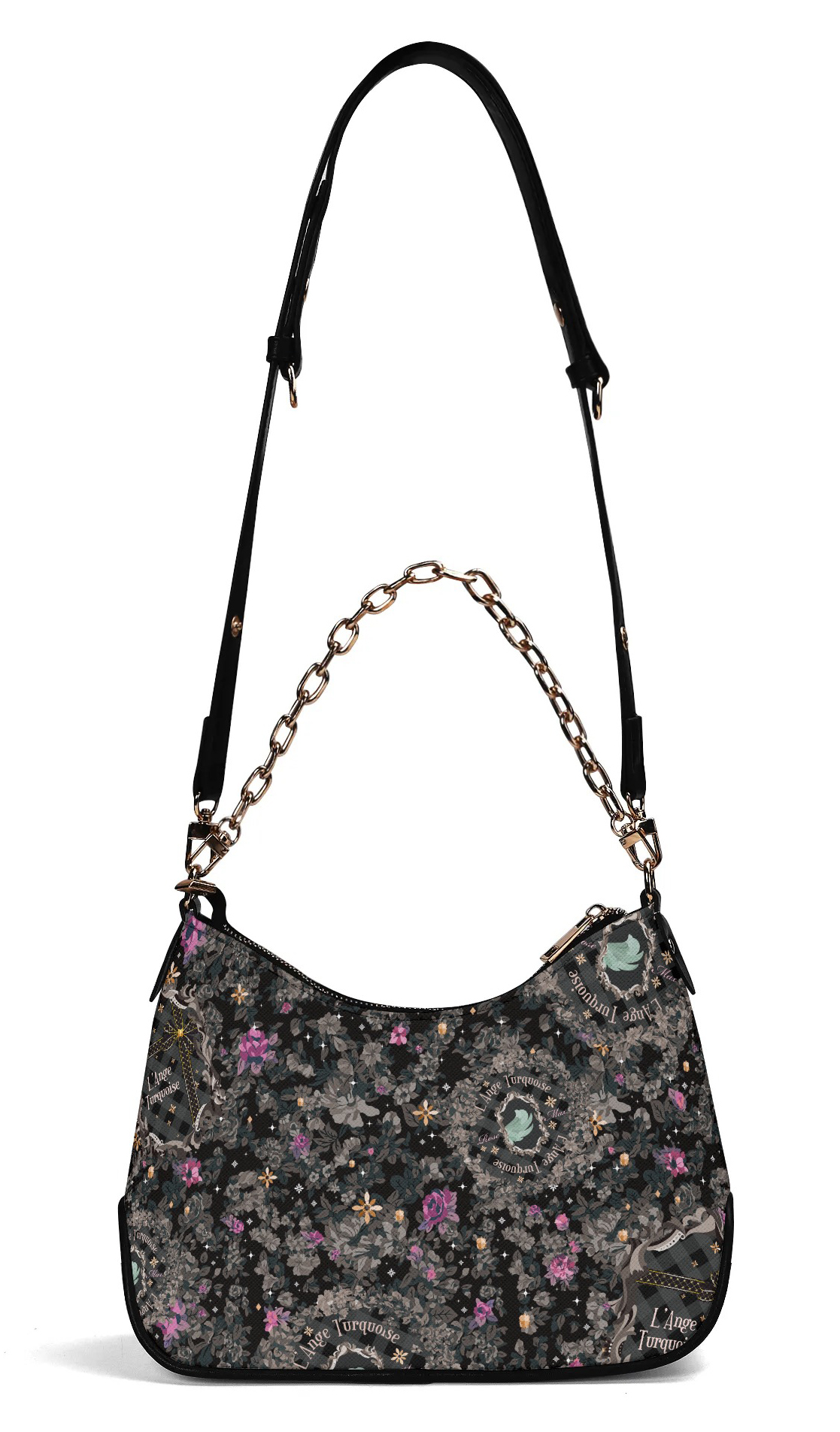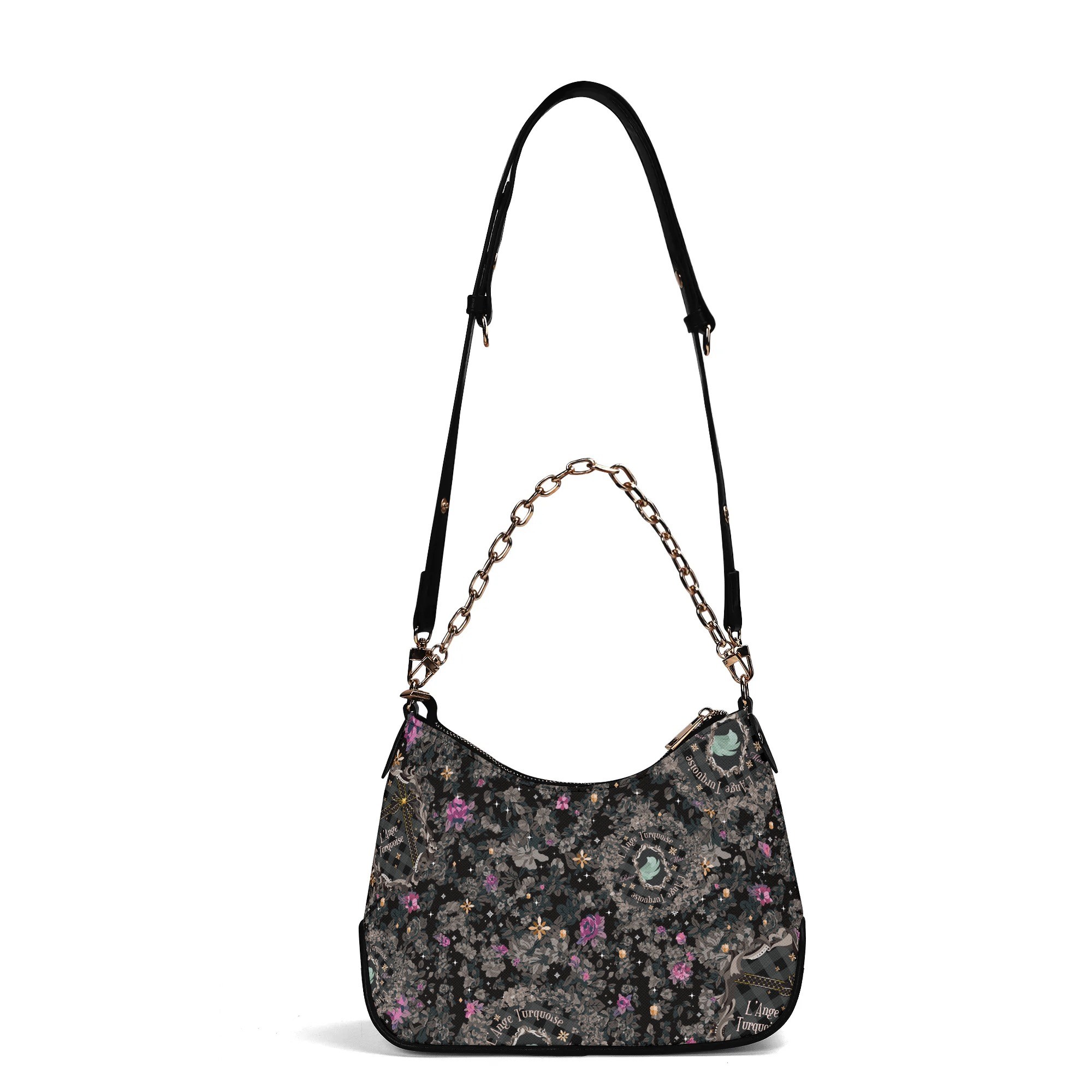 調節可能なショルダーストラップとゴールドチェーンの2つのストラップが付属しています。