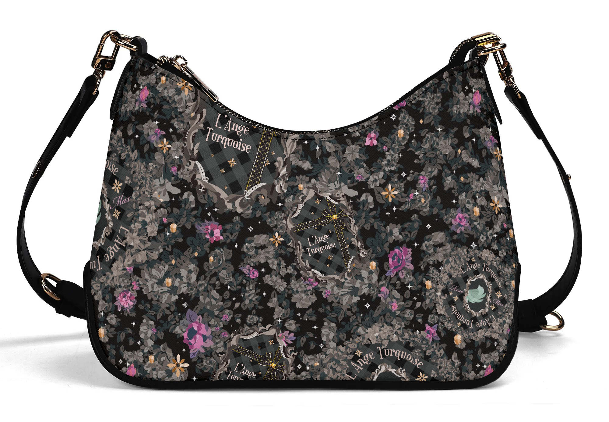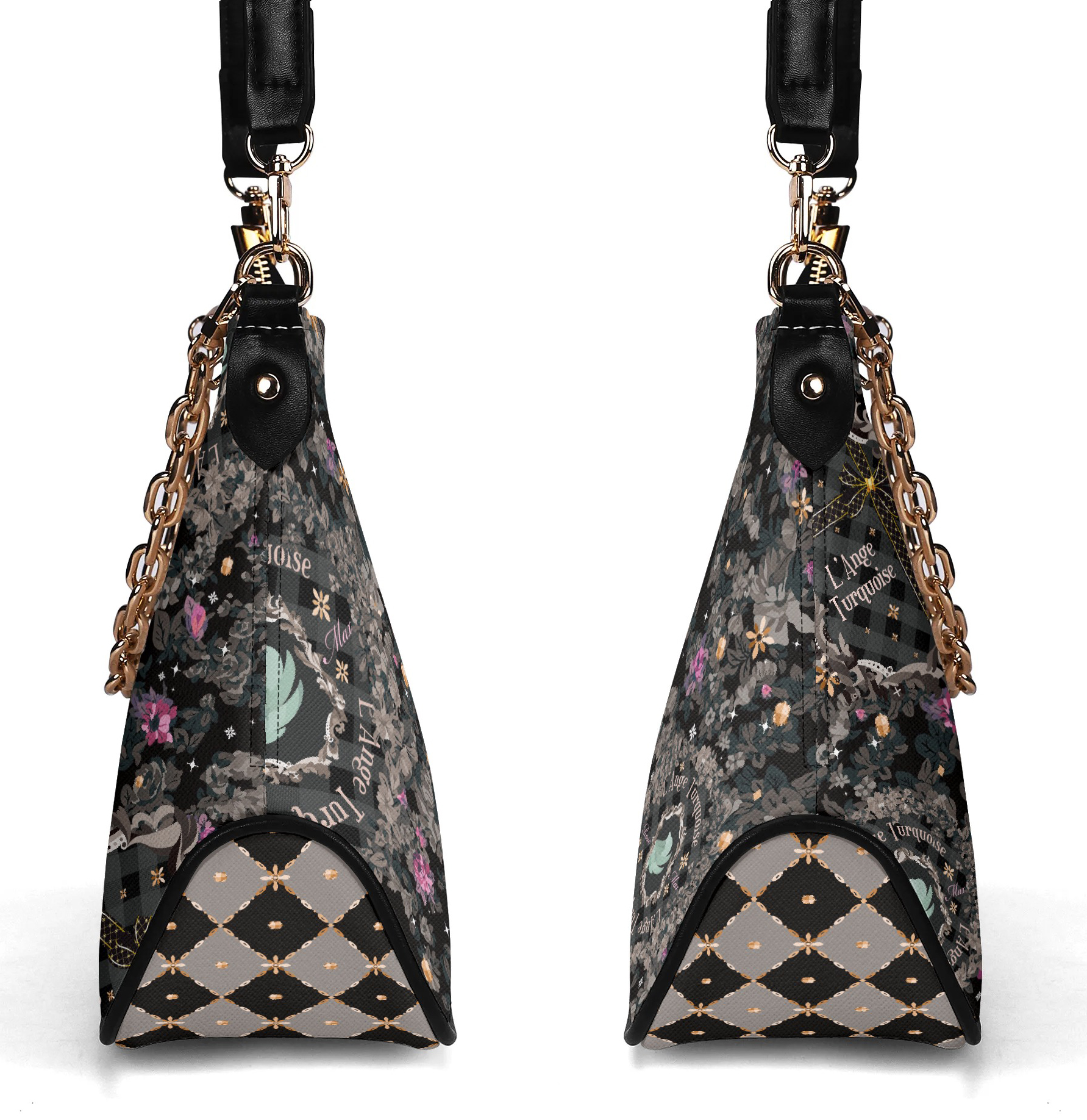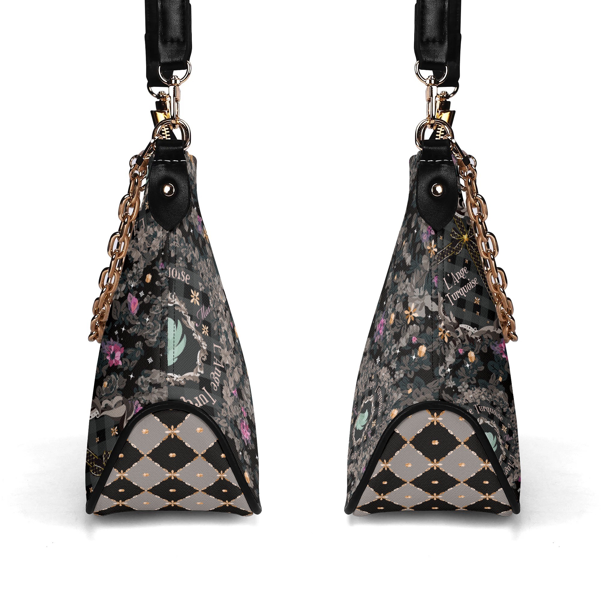 調節可能なショルダーストラップとゴールドチェーンの2つのストラップが付属しています。