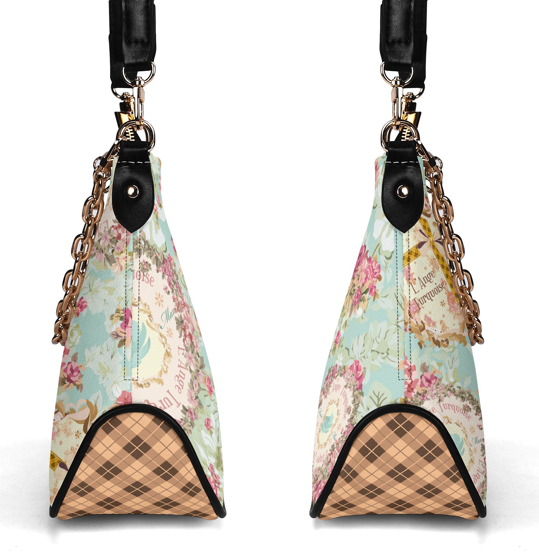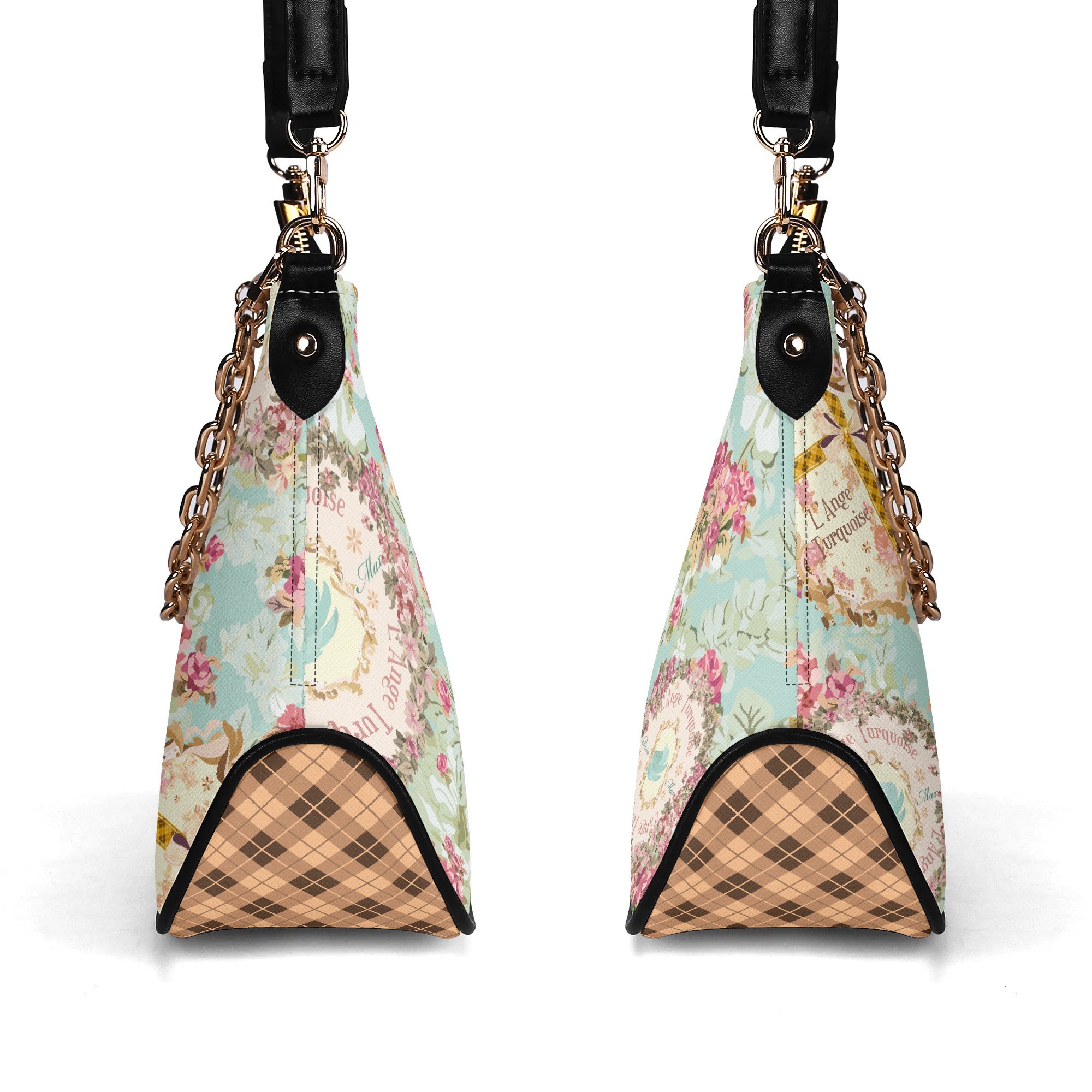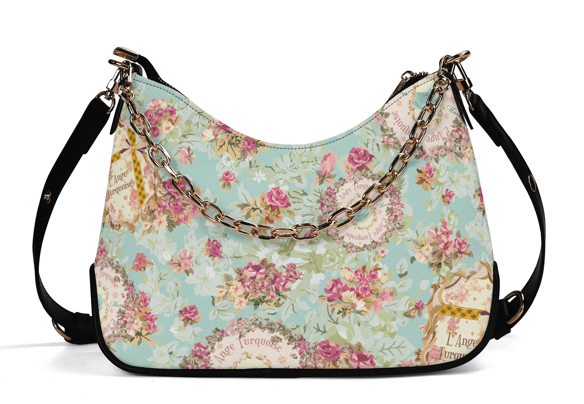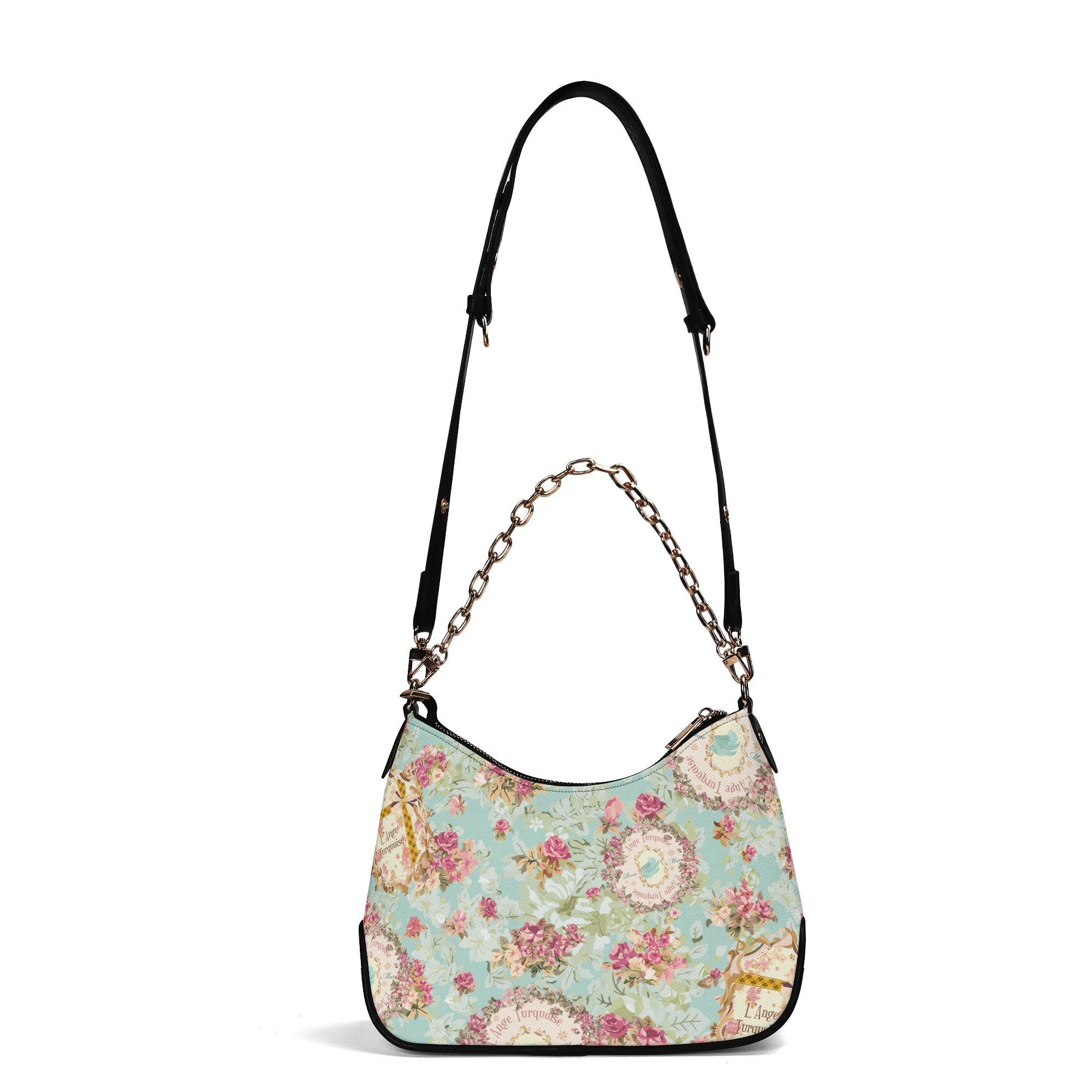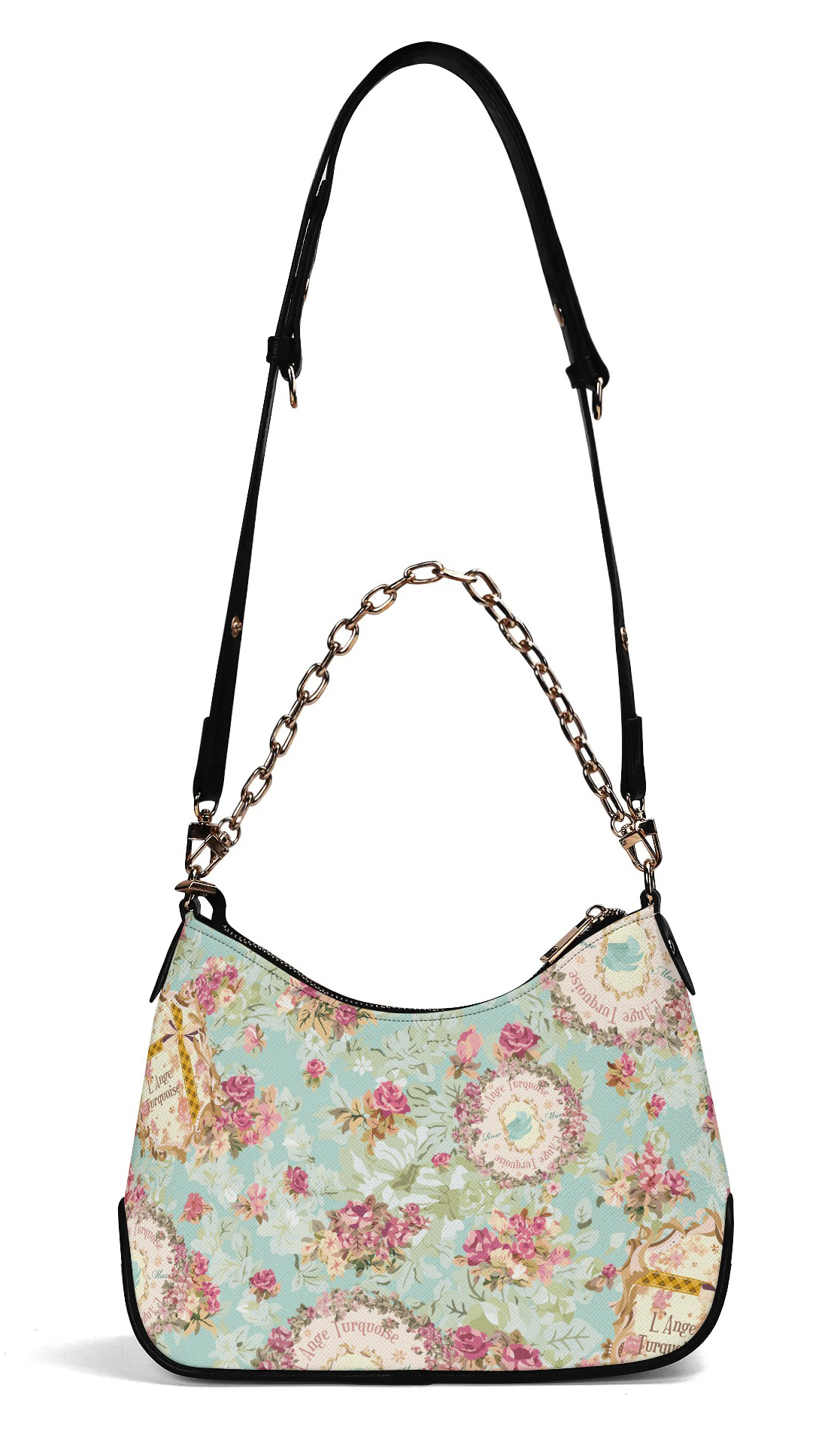調節可能なショルダーストラップとゴールドチェーンの2つのストラップが付属しています。
